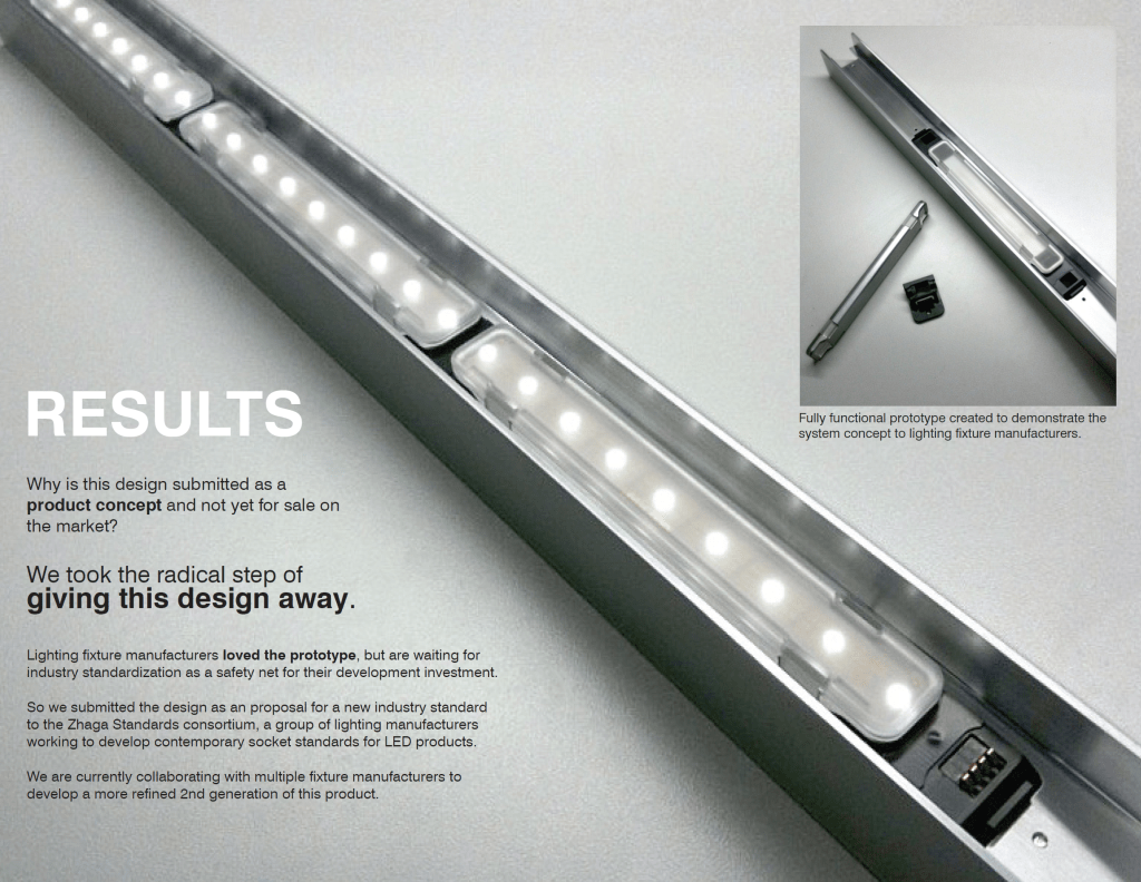 We also proposed our own variant of Zhaga standard that Philips had proposed. Philips Lighting at the time had launched an incredibly innovative Philips Fortimo LED Downlight module that included an integral dimmable line-voltage driver in roughly a “hockey puck” size unit, which mounted to a heatsink via an ingenious twist’n’lock ring socket design (which I believe was developed by BJB).