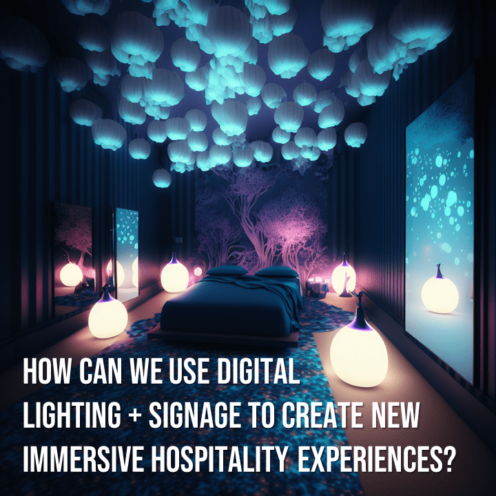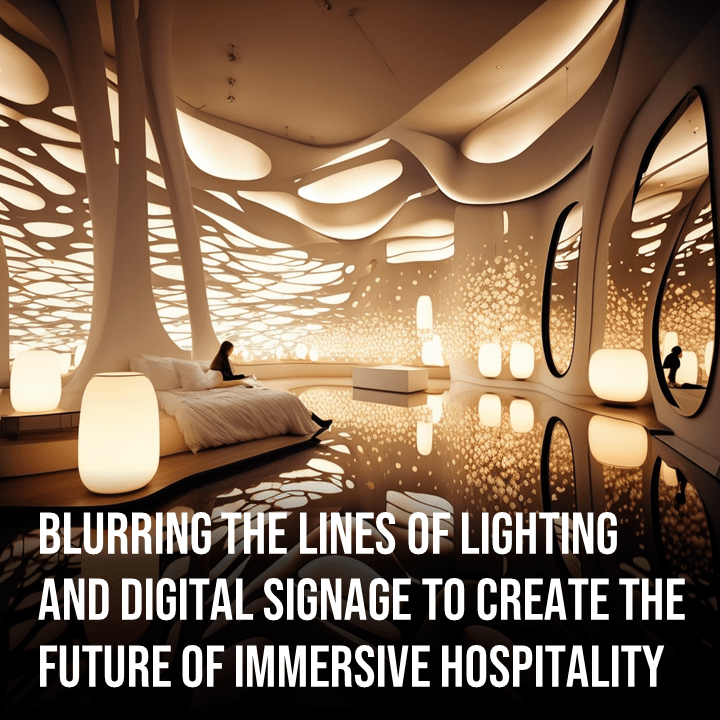 Let’s explore how digital lighting + digital signage will blur together to create stunning new concepts. These rooms can vividly switch from color to candlelight; can incorporate delightful patterns of movement and animation; and can extend the feeling of space using 3D anamorphic graphics on large format digital displays.