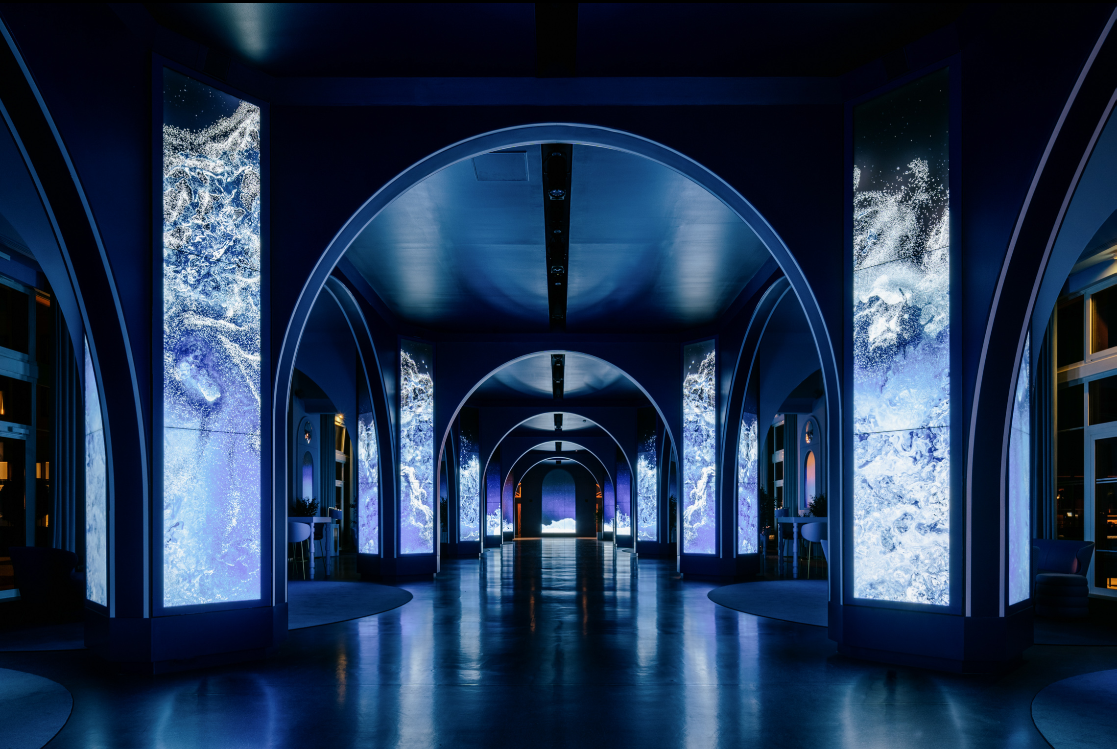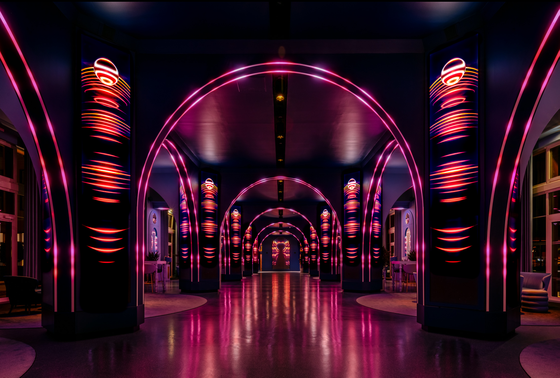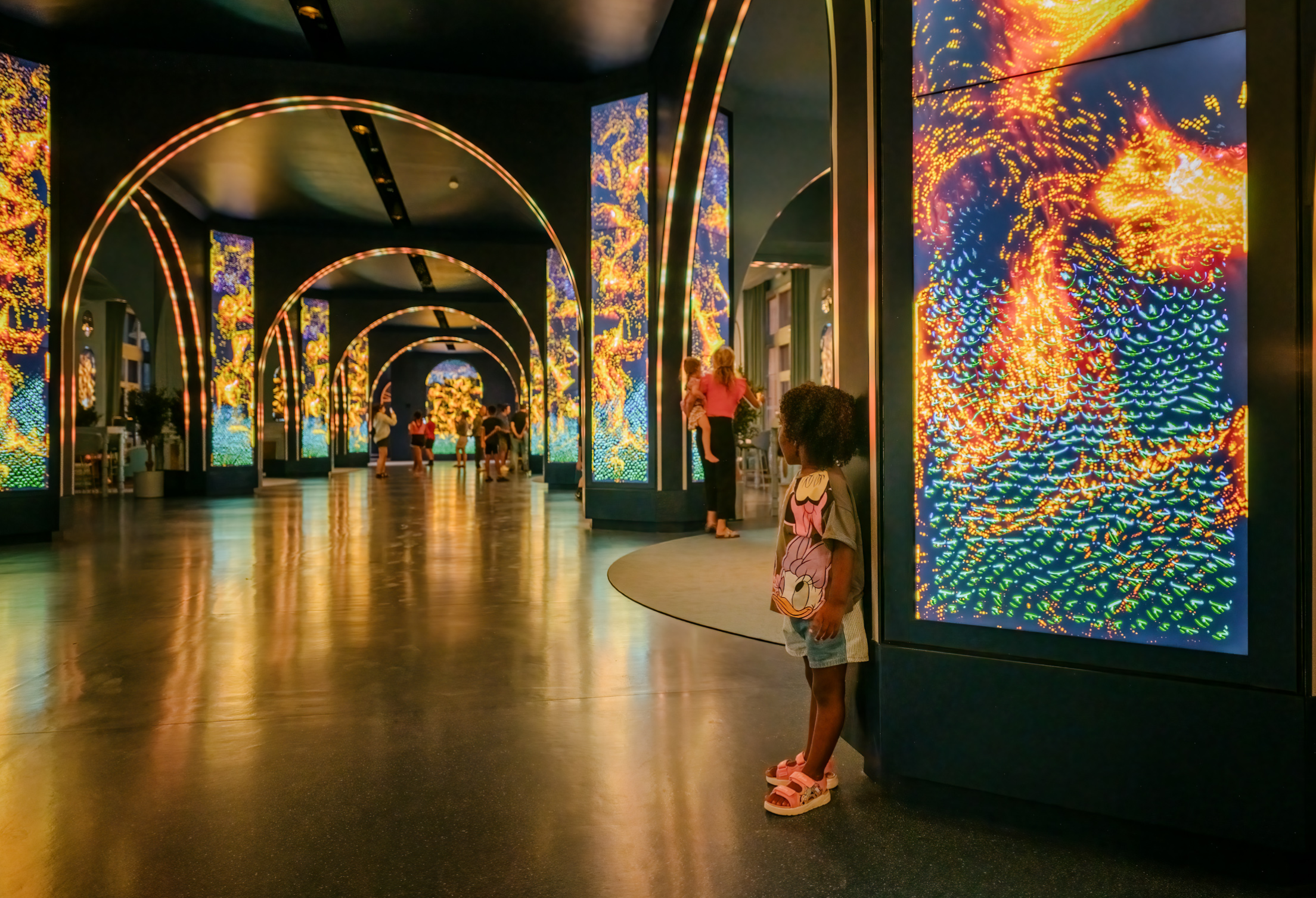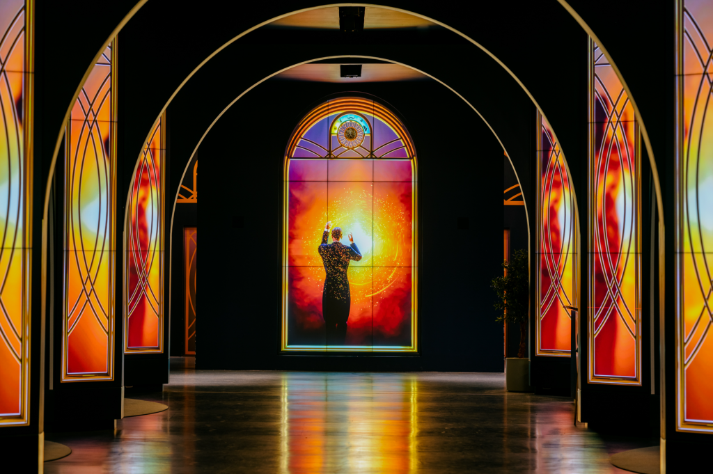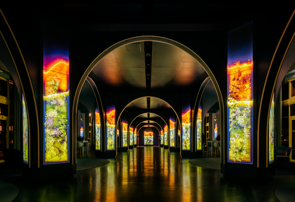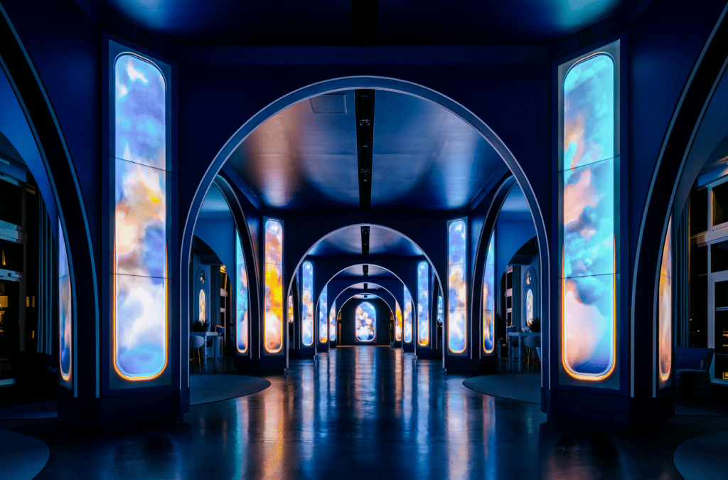 The primary columns consist of (120) 55-inch narrow-bezel LCD screens from Samsung. The arches are clearly RGB pixel/tape strips of some sort.