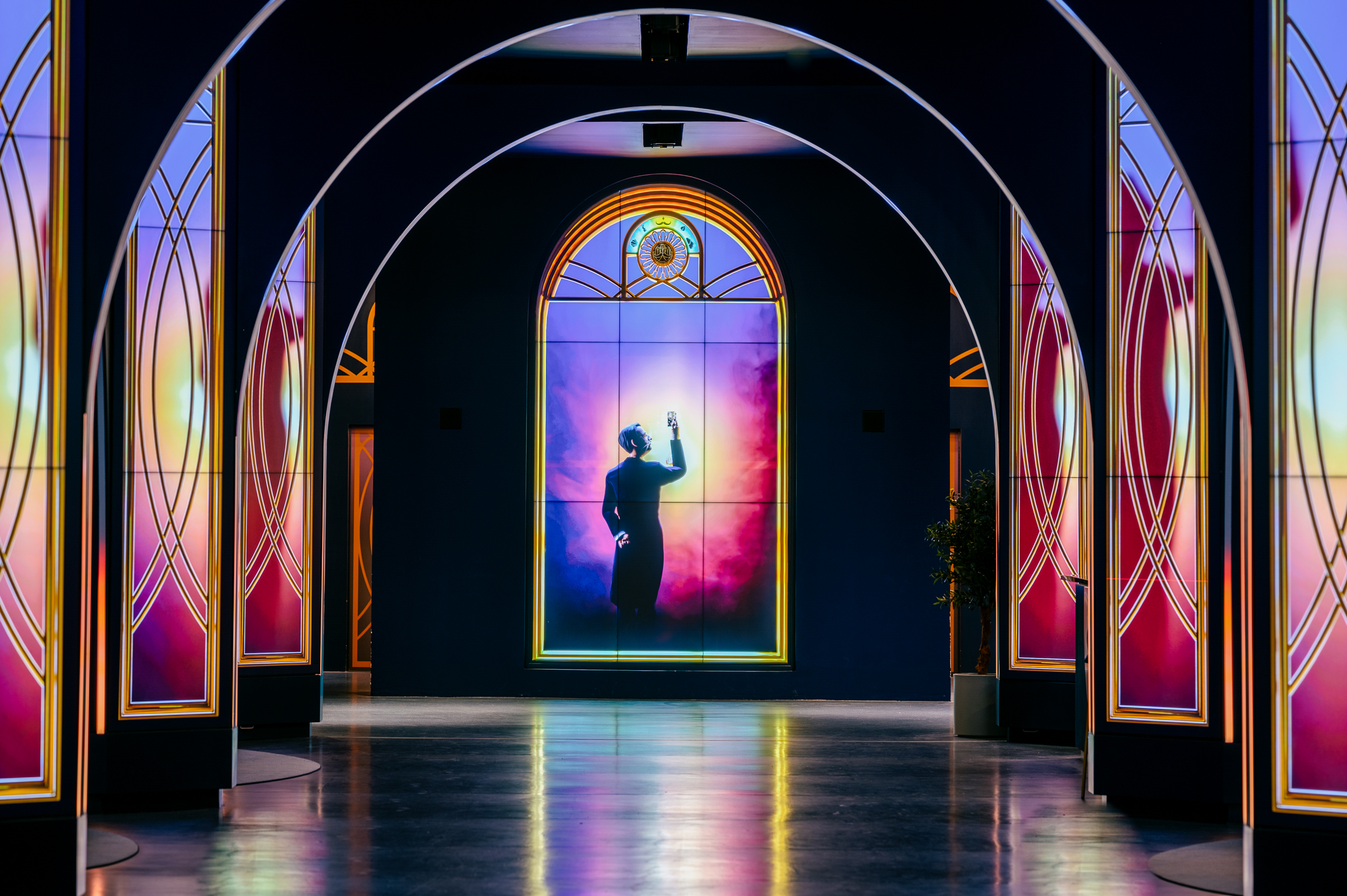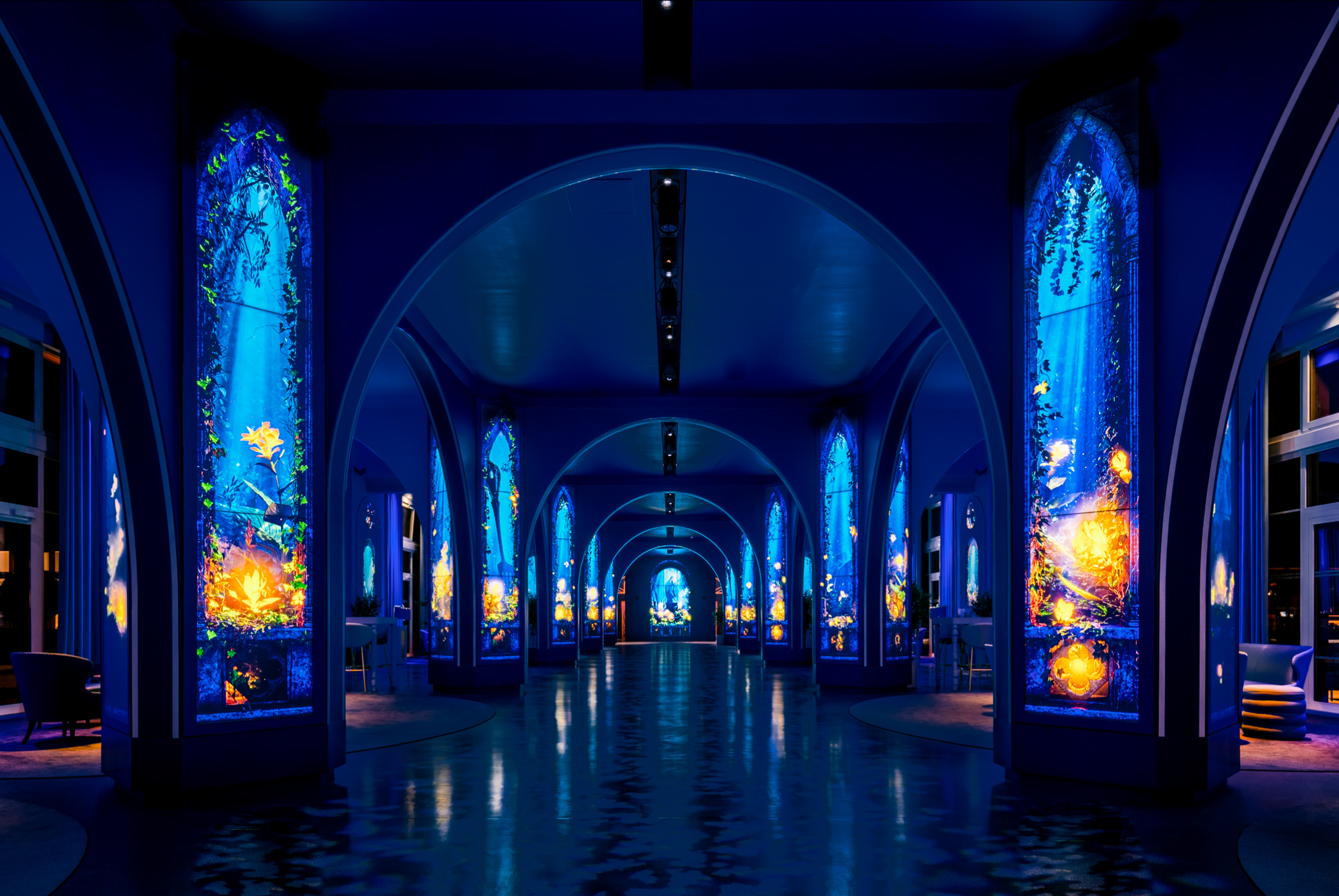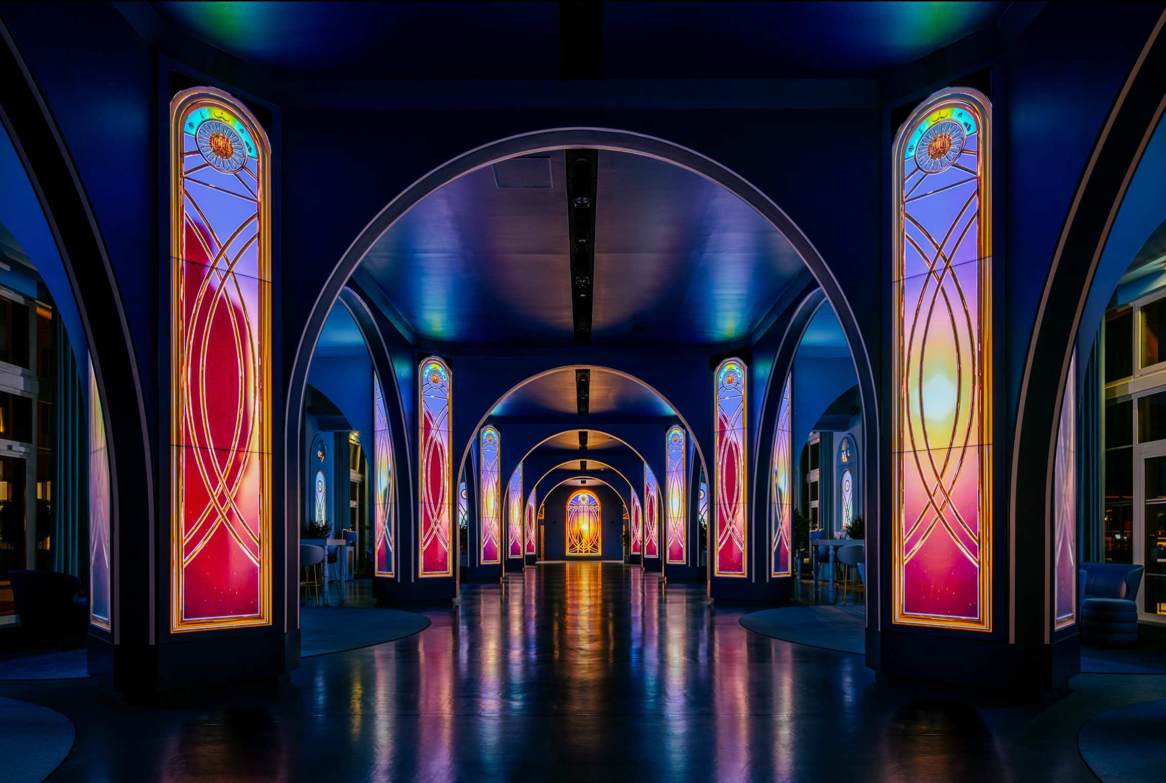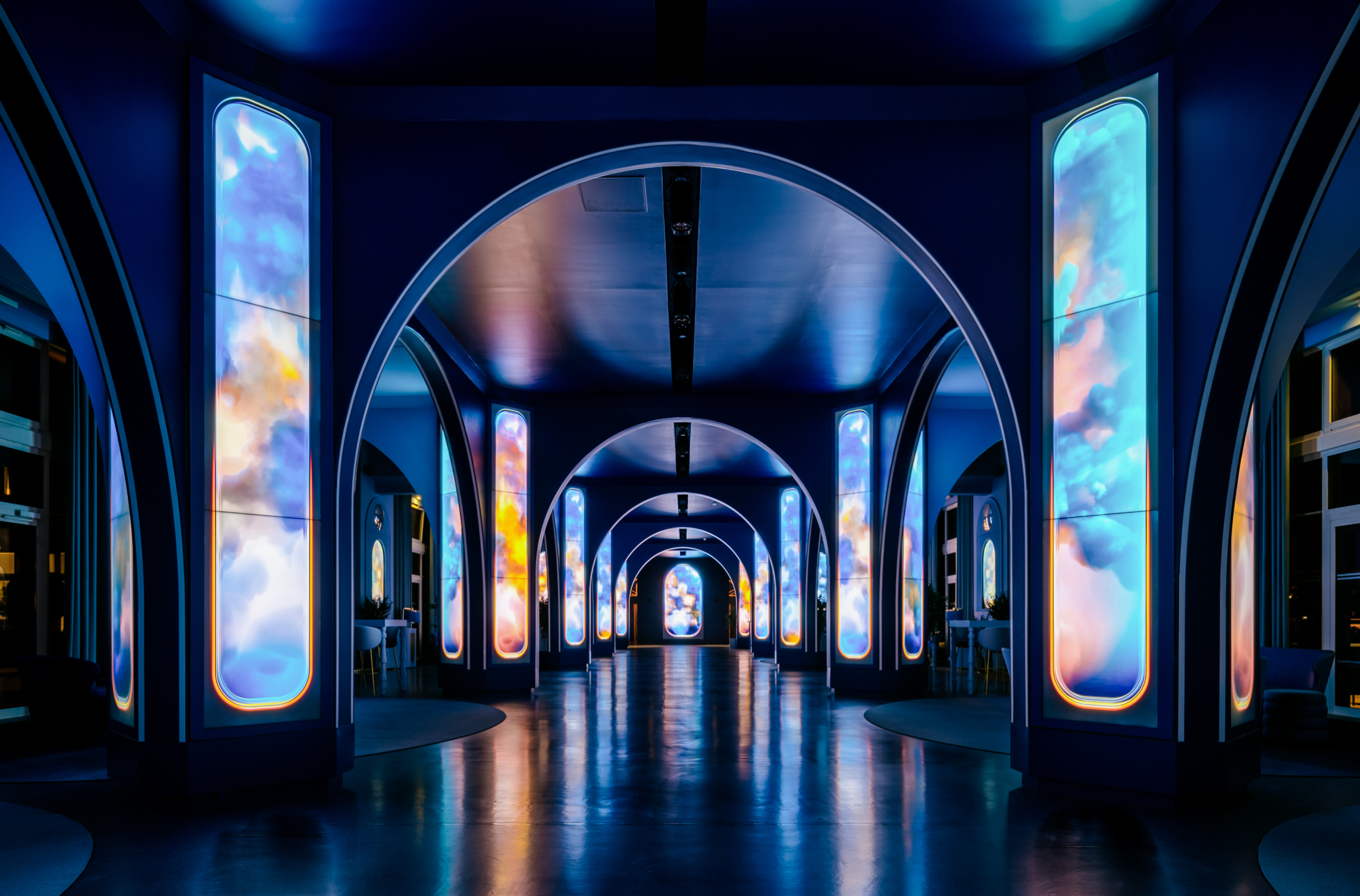 The primary columns consist of (120) 55-inch narrow-bezel LCD screens from Samsung. The arches are clearly RGB pixel/tape strips of some sort.