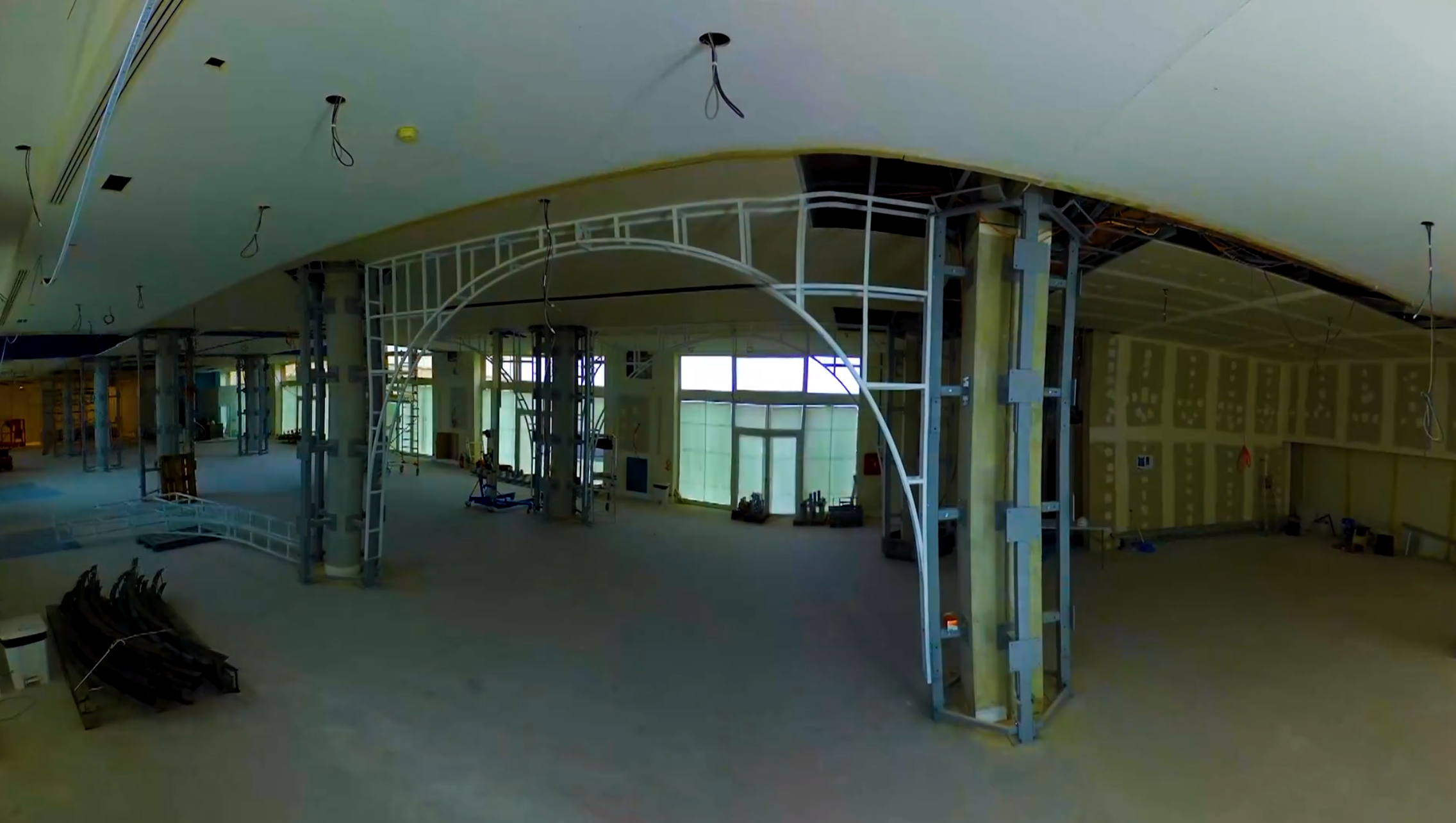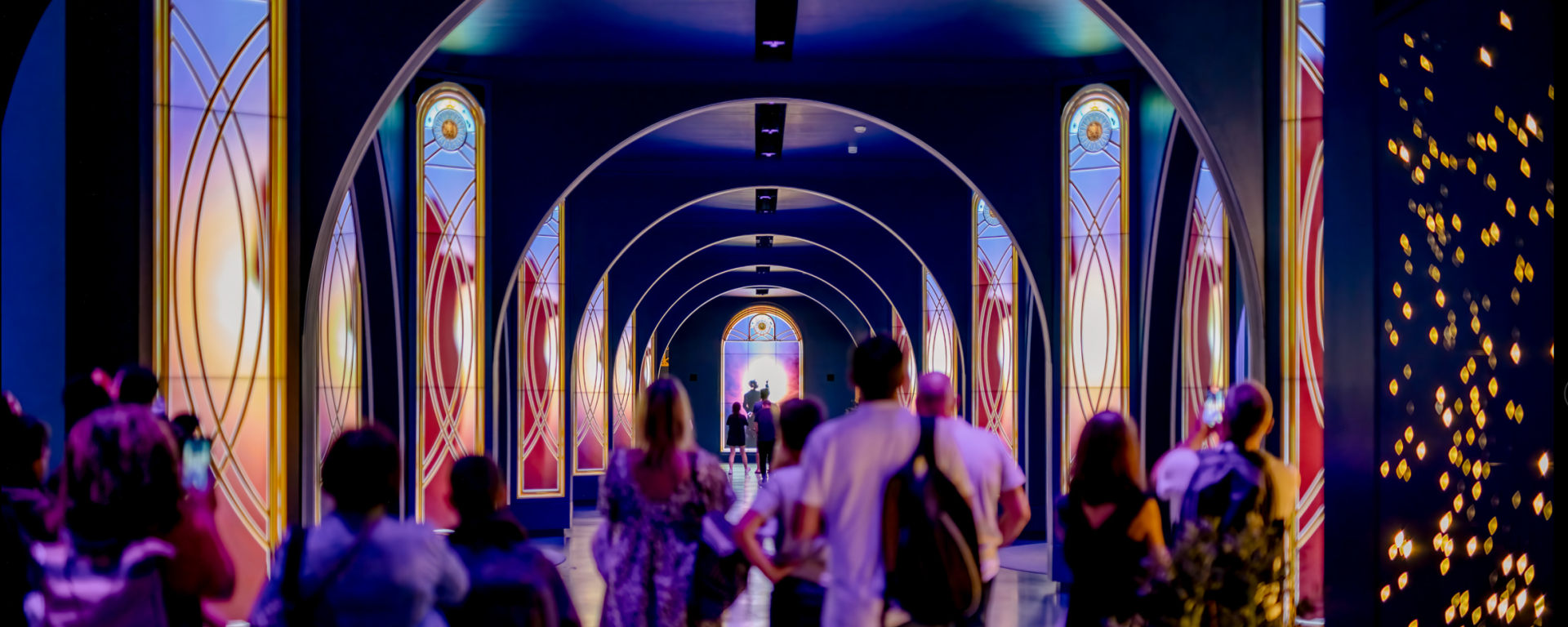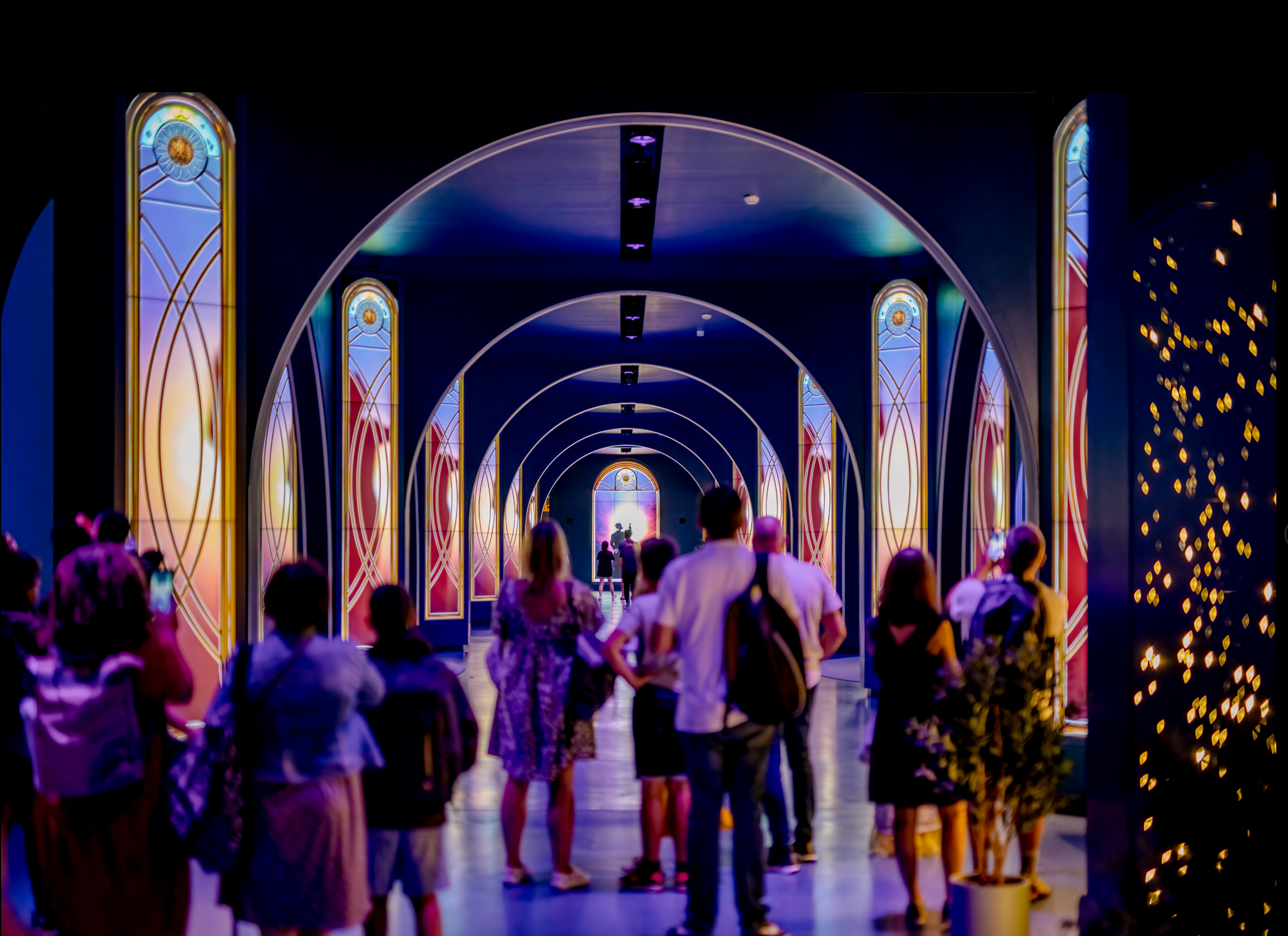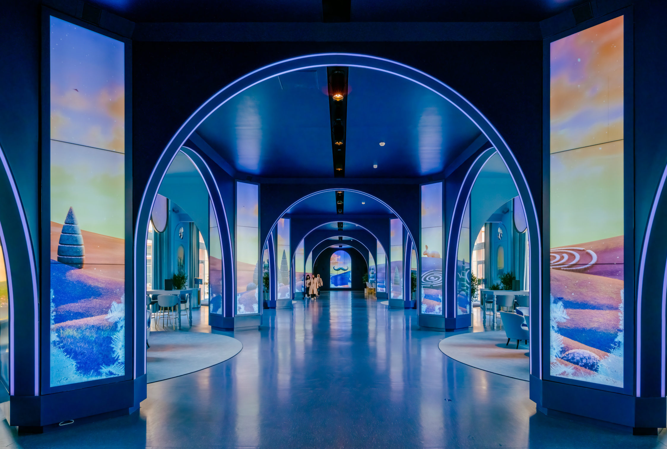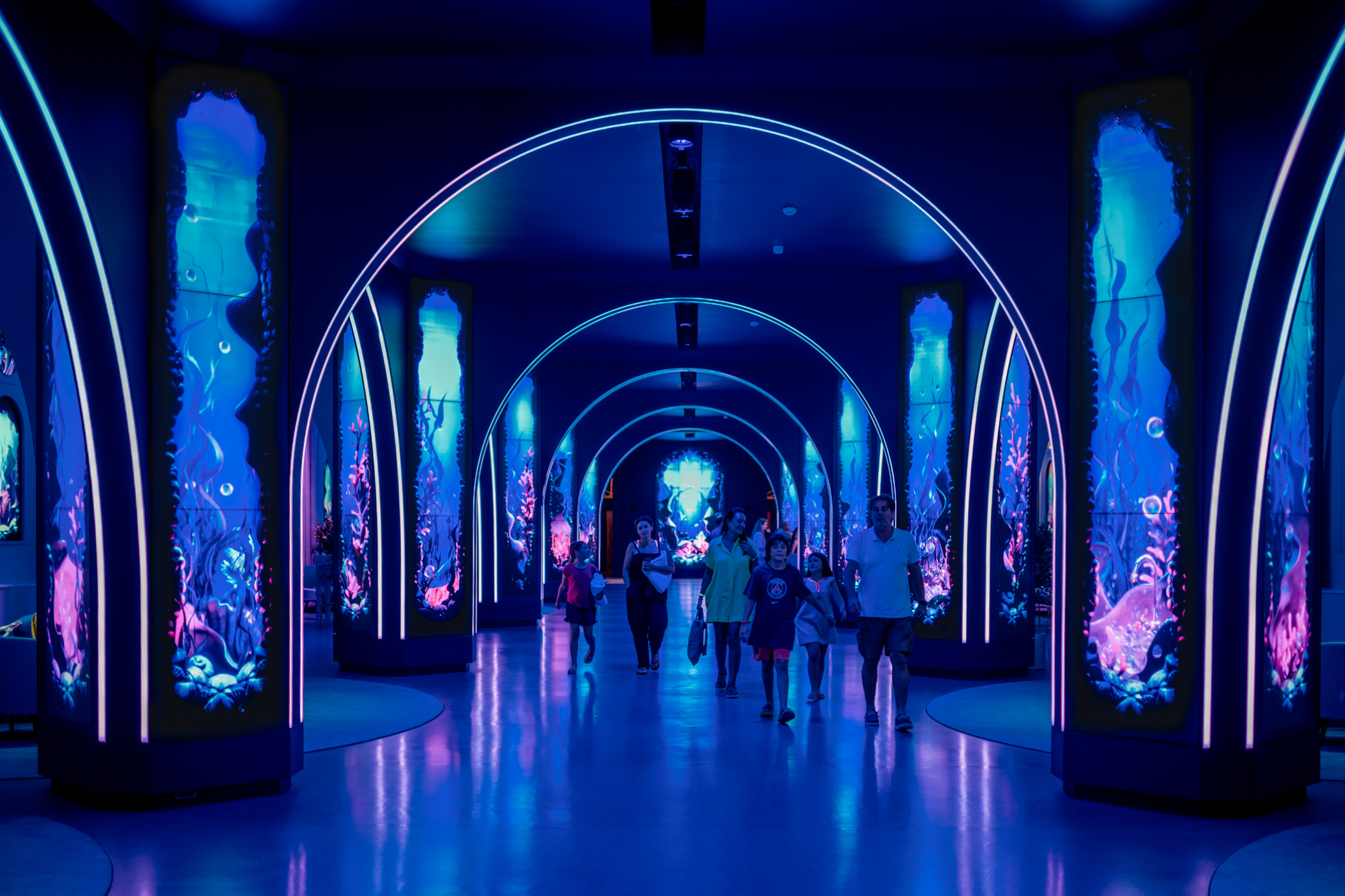 The primary columns consist of (120) 55-inch narrow-bezel LCD screens from Samsung. The arches are clearly RGB pixel/tape strips of some sort.