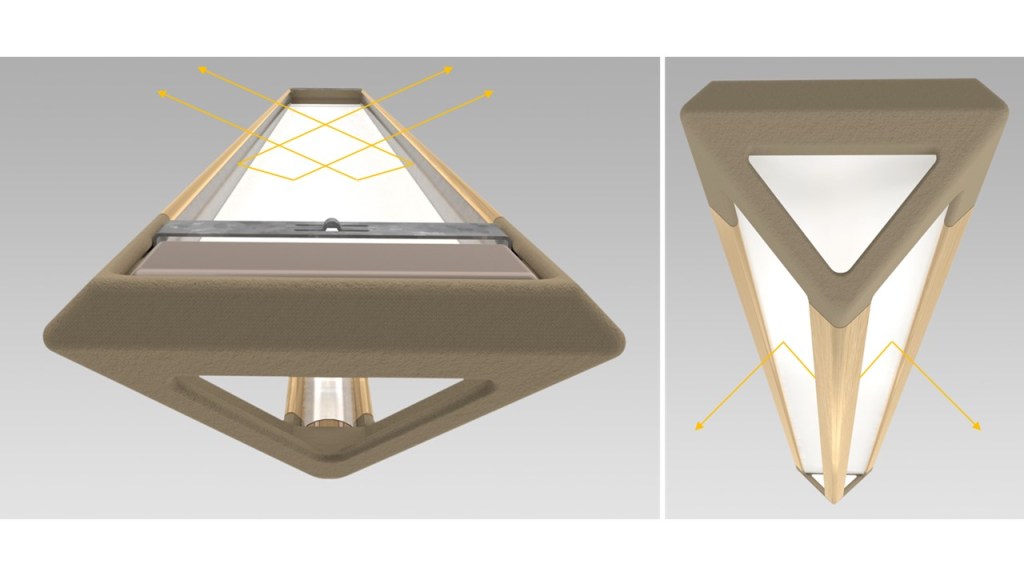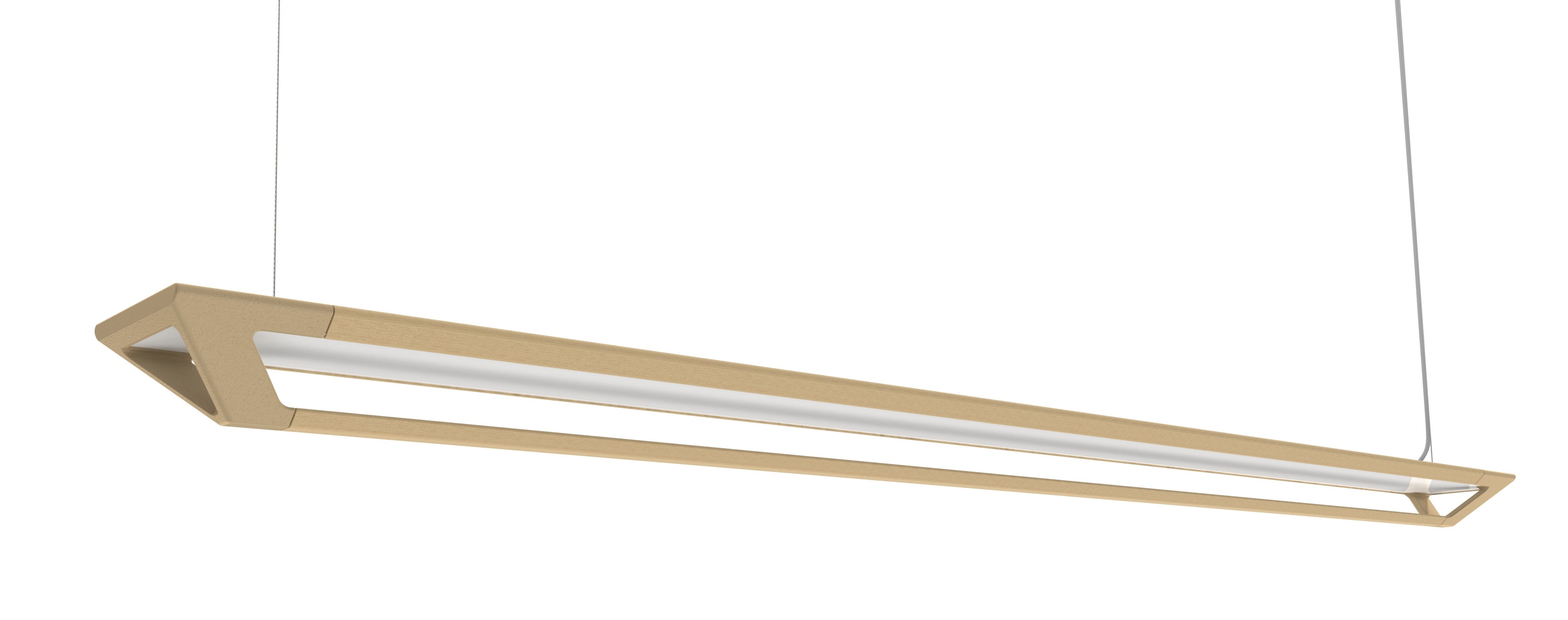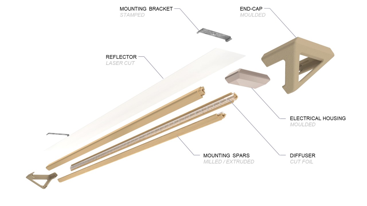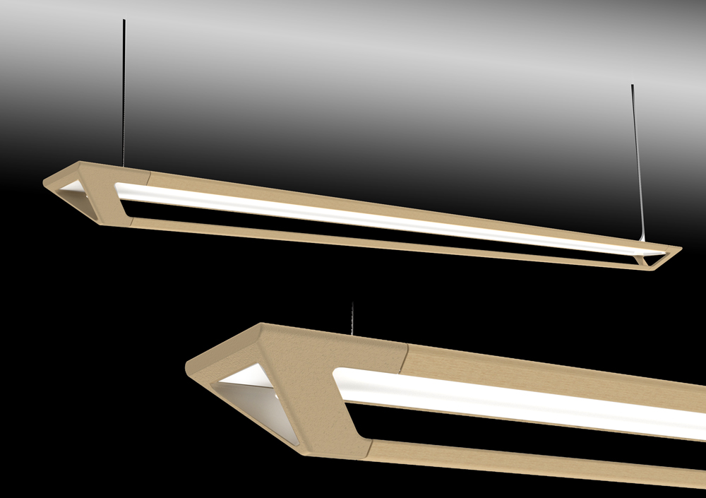 Since this was for traditional open office applications, we developed an iconic shape with a direct/indirect suspended pendant layout, with 2/3rds of the light aiming upwards in a “poor man’s” batwing distribution, the other 1/3rd bouncing off a reflector for a pleasant, bright glow from below. The product team quickly focused on stripping away as many toxic and high-embodied carbon materials as possible. We used engineered bamboo mounting spars as they retained the performance of metal extrusions; a biodegradeable, biomaterial-based plastic for the injection molded endcaps (which would take up much of the complexity without additional components); a very thin high-efficiency white reflector panel (a compromise for efficacy); and a DC-supplied PoE driver to get rid of the high-voltage safety issues.