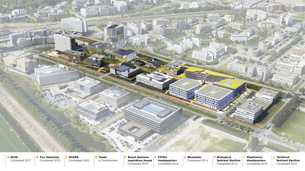 Turns out that William McDonough Partners was designing the masterplan for the ultra-sustainable Park 20|20 office park development not far from Amsterdam’s Schiphol Airport, along with being the design architect for all the buildings. Park 20|20 is an absolutely gorgeous collection of premium Class-A offices with an intense focus on using cradle-to-cradle design principles throughout. Building Park 20|20 was Delta Development, whose CEO Coert Zachariasse turned out to be a huge global advocate for sustainable design. At the time Delta Development had several buildings completed with many more in various stages of design.