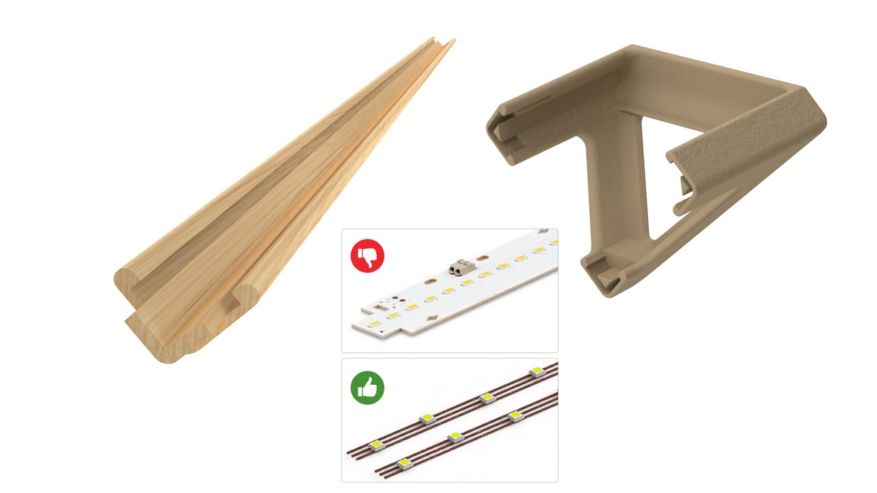 A major feat was getting rid of the FR4 printed circuit board for at least the LED strips (the driver still used a traditional circuit board, but we were hoping to get rid of that eventually, too). We used a novel, patented method from the Research group to place LEDs directly onto copper wire strips in a standard pick’n’place/reflow process. The copper wire was enough to dissipate the heat. We mounted this LED/wire strip in a bioplastic clamshell unit to protect the LEDs and structure the strips. I can’t tell you how much resistance we had to this – “experienced” engineers absolutely insisted we needed a heatsink to achieve the needed thermal dissipation. They were so locked in their “craft” that they couldn’t believe it worked even when we built a fully functional prototype. The performance of the fixture was fine, even using 2013-era LEDs, because we fundamentally chose in the design concept to spread the LED wattage over three legs in wide-open air flow.