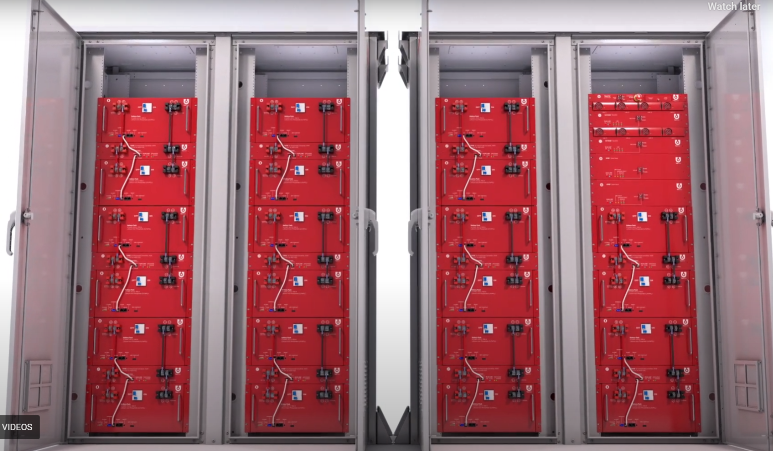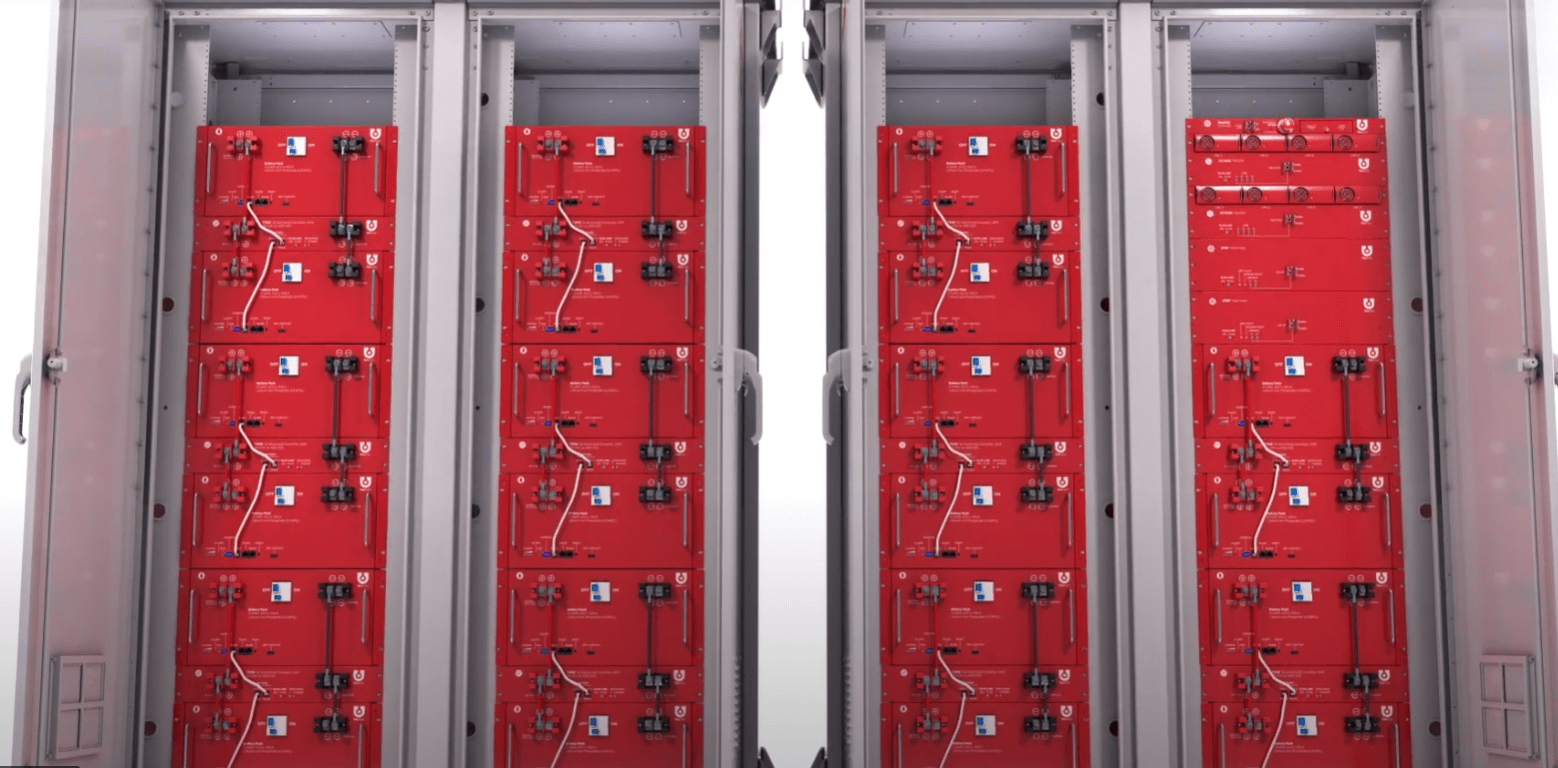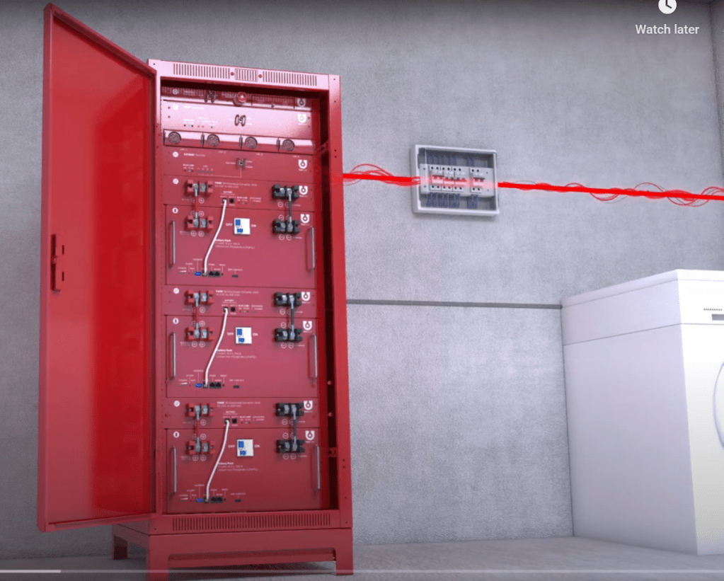 (During the demonstration, the front doors of the PowerBloc were removed. There are no dangerous high electric potentials in the front of the system.)