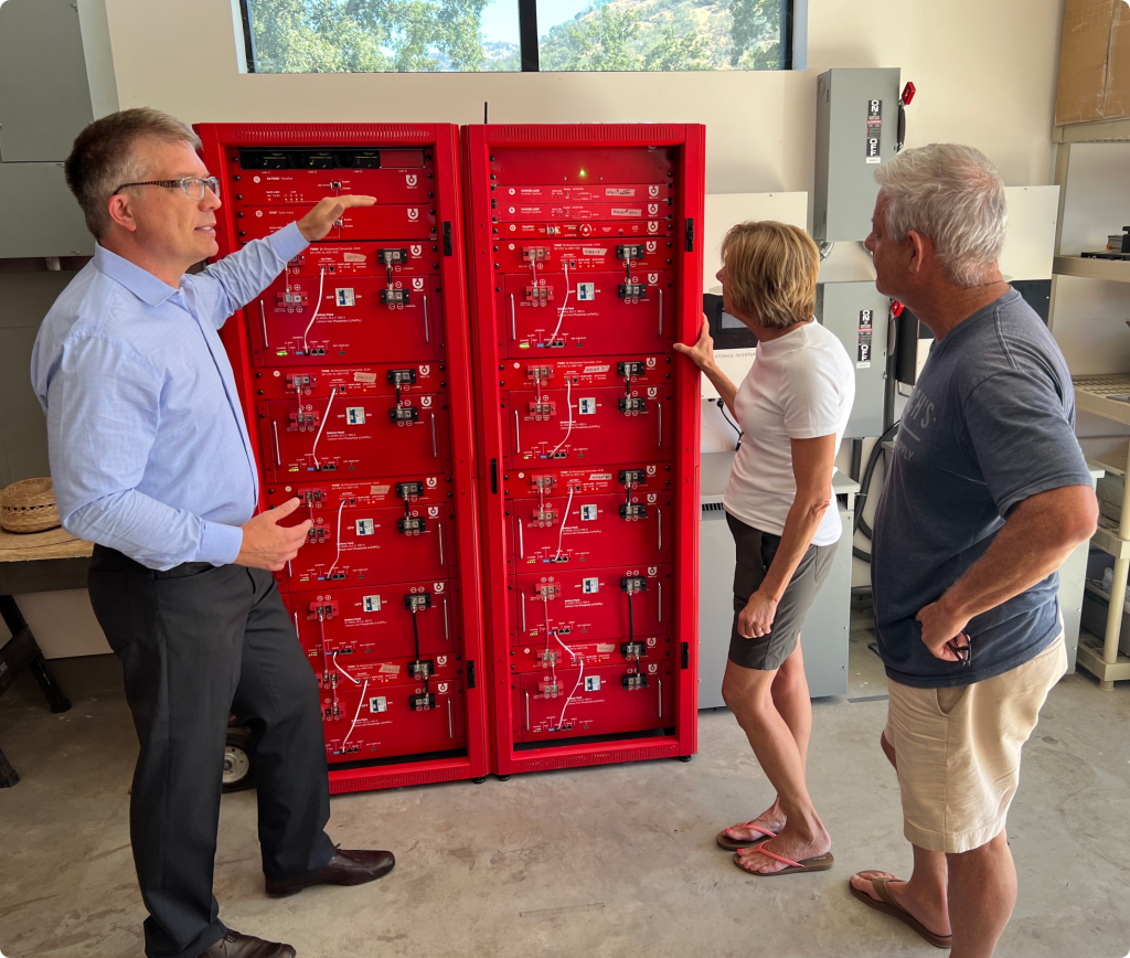 The picture above shows Arnold Leitner, CEO, explaining the PowerBloc® to its owner. The system shown here is a two-cabinet PowerBloc with 10kW of solar, 50kWh of energy storage, and 38 kW of inverter power.