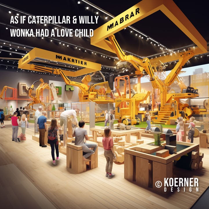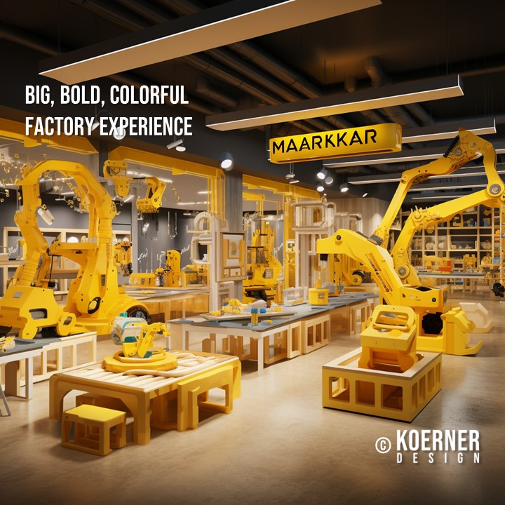 Now thanks to A.I. image generation, I can share my vision: A bright, bold, fun environment where kids can run free from station to station or follow prescribed “challenges” that they can choose. It would be highly kinetic with gliding overhead cranes, robot arms moving around, conveyor belts whirling, etc. As if Caterpillar and Willy Wonka had a love child. Mixing the warmth of wood floors and old beat-up wooden workbenches with high-tech robotics, factory workstations, toolcarts and power tools.