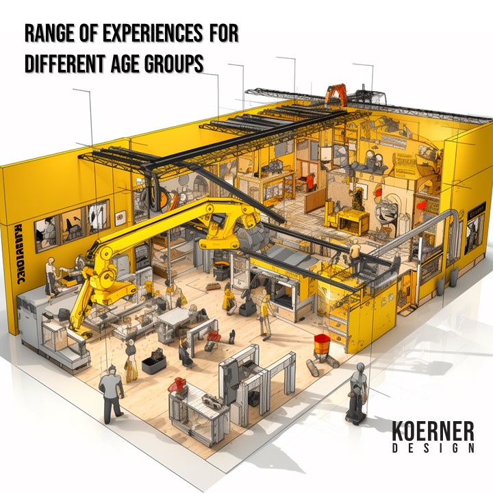 Sections could be divided for different age groups: A “workshop” for 3-5 year olds, a “factory line” for 6-9 year olds, and a “construction site” for 9-12 year olds.