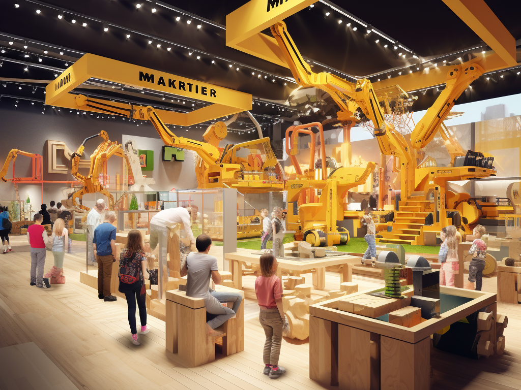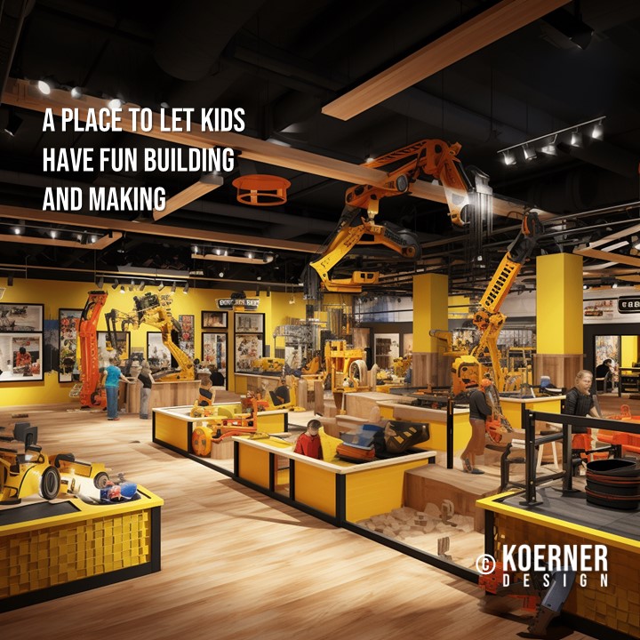 The trick would to be use modern technologies to make everything feel “real” and “dangerous” while being totally safe for free-roaming kids. For example, a welding robot might use digital projection mapping to make the sparks, molten metal and cooling slag at a robot programming workbench. Interactive projection mapping could guide kids through projects and challenges on workbenches. It would fuse the best elements of old fashioned video arcades, maker labs and science museums. The “E-ticket” attraction would be a virtual excavator experience – where kids sit in a REAL excavator cab that sits in a virtual live-rendered 360 surround screen. To the child, it feels like they are really digging with a massive piece of equipment! Or a virtual crane experience!