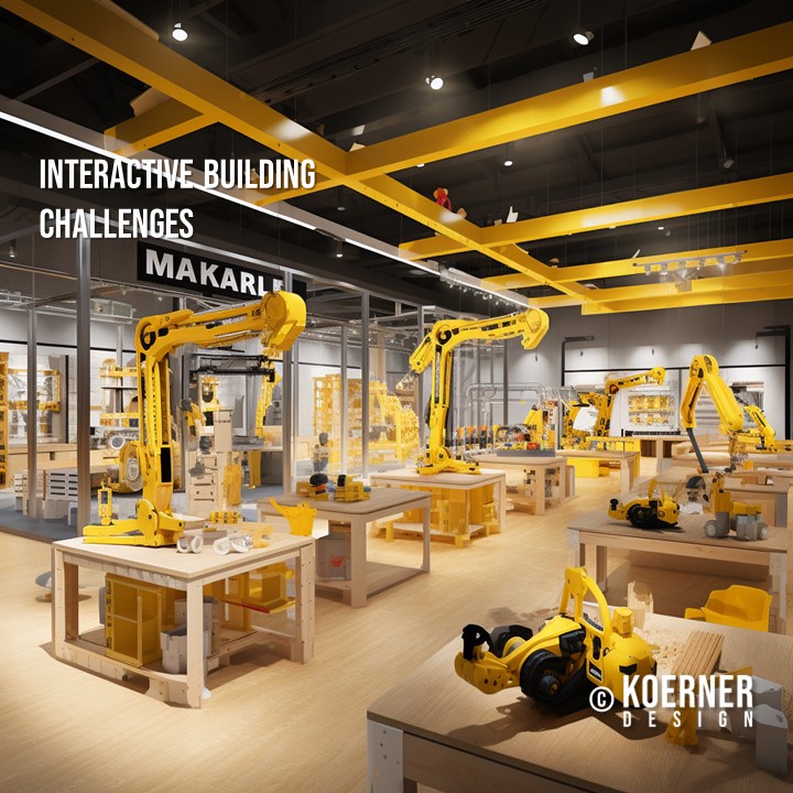 Sections could be divided for different age groups: A “workshop” for 3-5 year olds, a “factory line” for 6-9 year olds, and a “construction site” for 9-12 year olds.