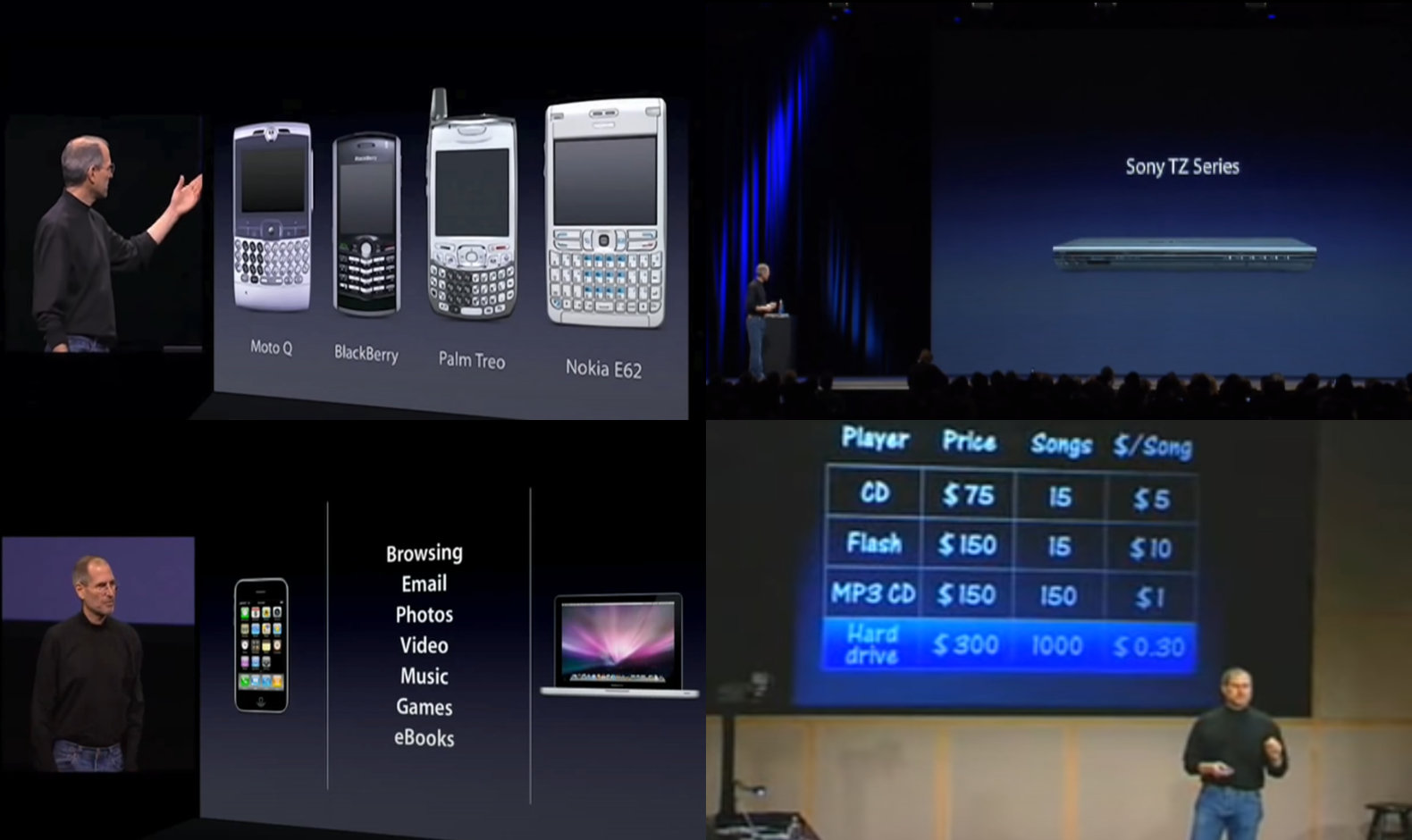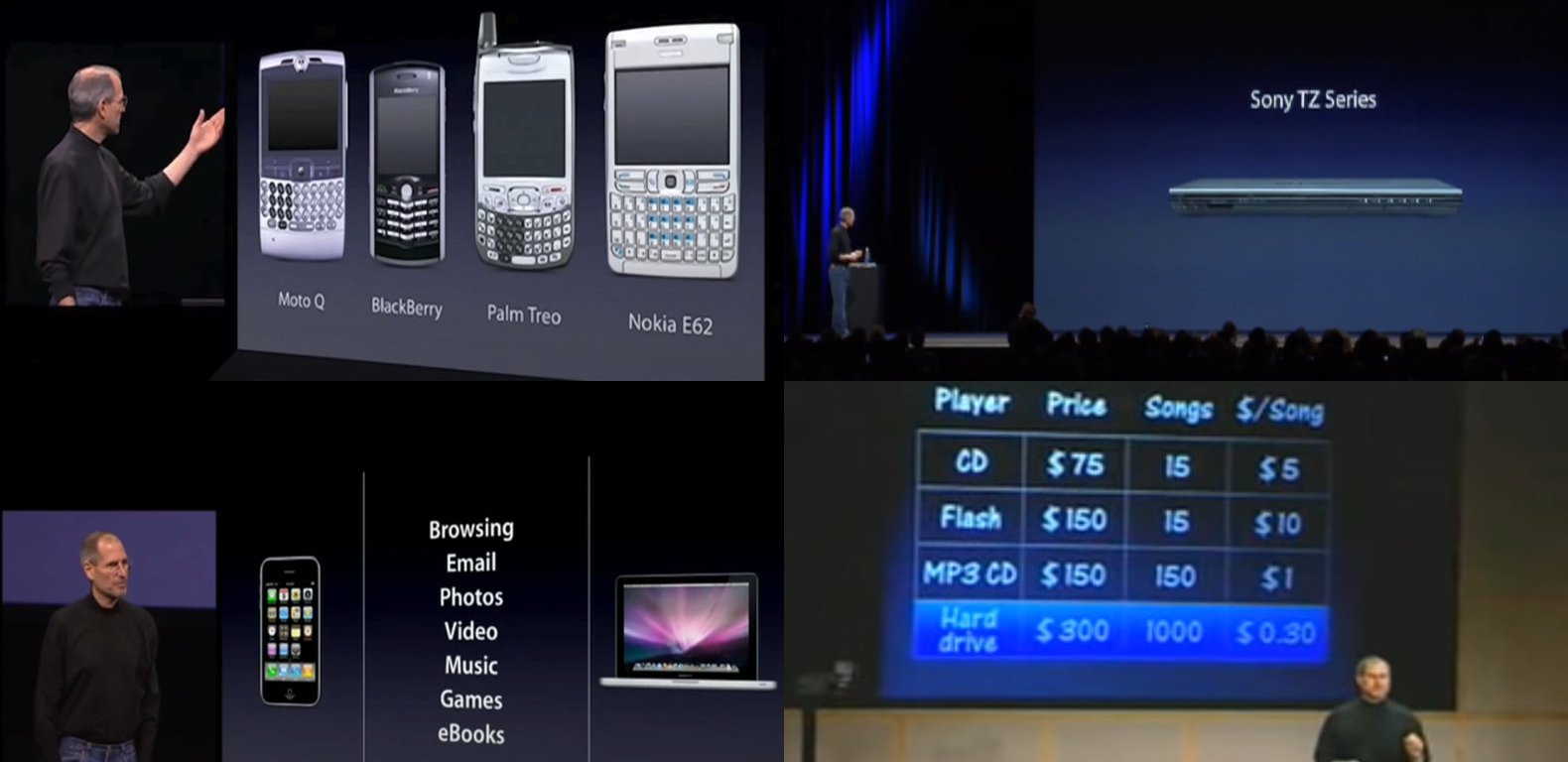 Jobs did it with nothing but straightforward, earnest facts, but the end result was a devasting critique of those incumbent solutions. He was never petty, never vicious, never spouting baseless, snide criticism. And he did it with slides that were often nothing more than a single image on a blank background.