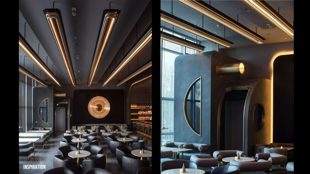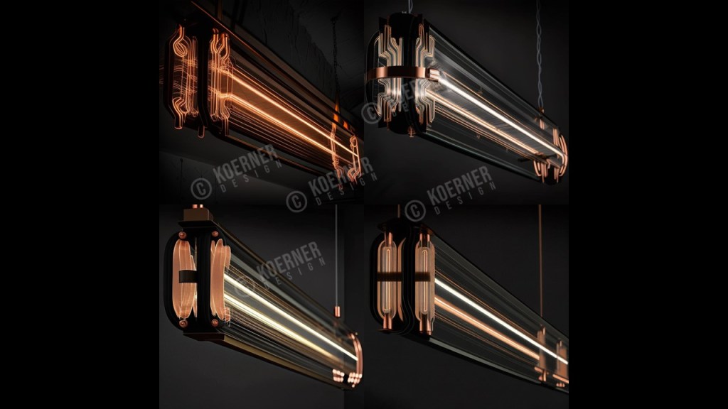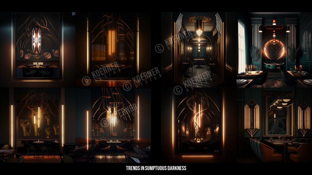 I pitched a decorative lighting company a line of art nouveau inspired pendants and sconces that use flexible LED filaments, blackened- and polished-copper accents and lots of refractive glass. I believe that AI image generation will drive a revival of rich, decorative arts in interior design. I also believe that unflinching white’n’bright Scandinavian design has been pushed too far in hospitality, and that people crave “sumptuous darkness” in their evenings out. Enjoy!