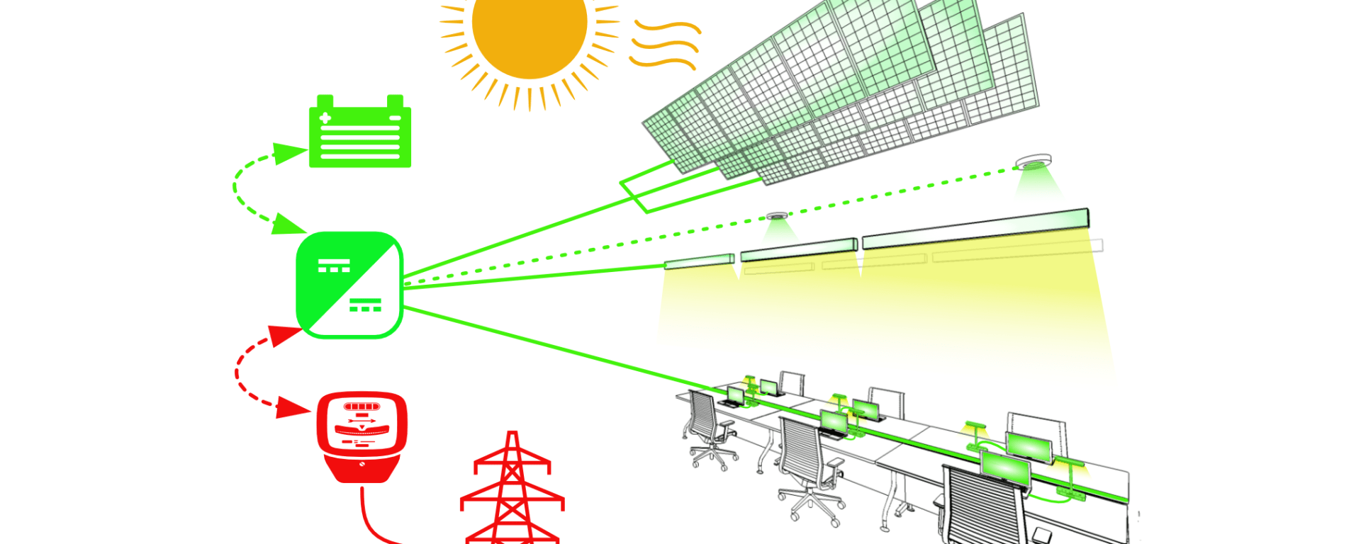2. The project internally uses a high-efficiency DC-coupled power infrastructure as it’s primary electrical service, fed directly unconverted to DC-powered lighting fixtures. Photons to electrons to photons with no alternating current to be had.