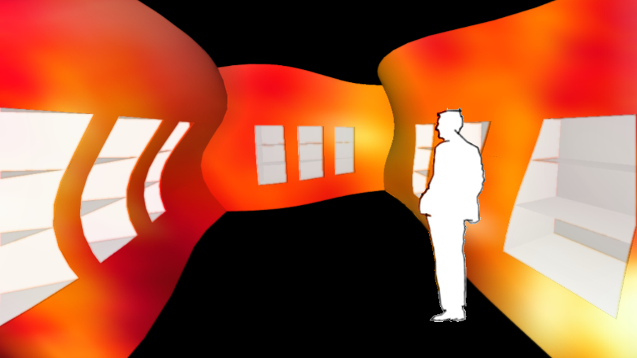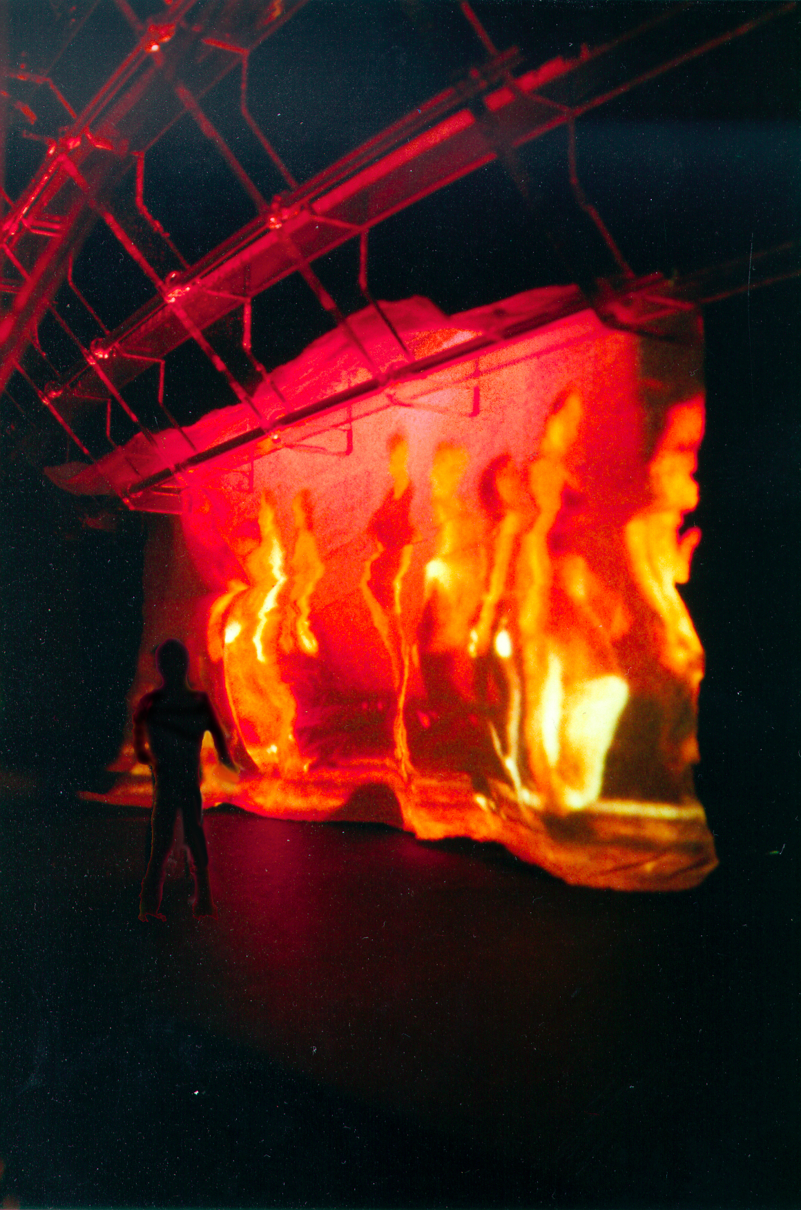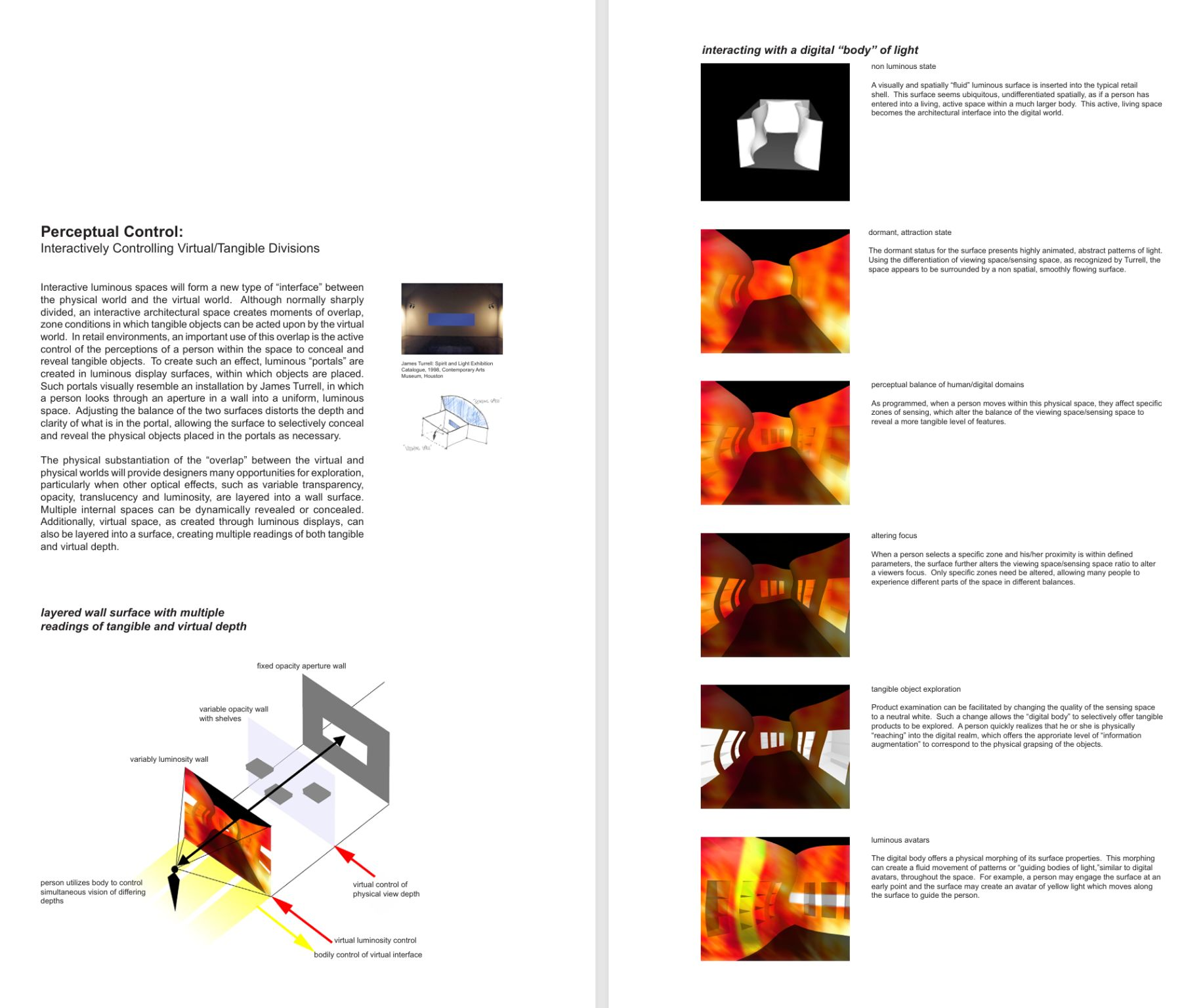 James Turrell, with his “ganzfeld” art pieces, provided direct inspiration for the concept of “layering realities” in physical space. Once you fundamentally understand that light — all light — is additive, and that this magical digital “textile” could be diaphanous, you can layer physical/digital/physical or digital/physical/digital or any combination, along with normal projected lighting and internal glowing objects. Hence the titled of my thesis: “Active Objects, Surfaces and Zones“.