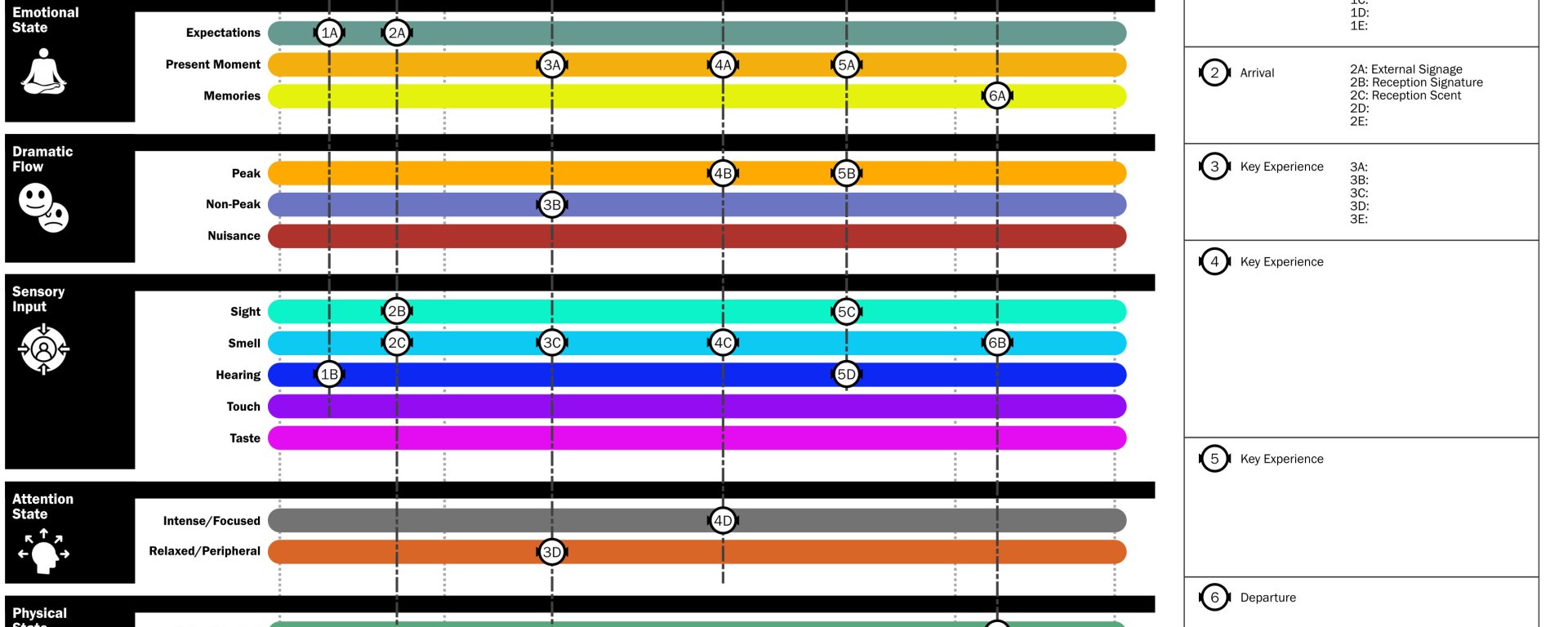 This starts as a very useful gameboard brainstorming tool to start defining and capturing key ephemeral moments. It is focused on the occupant experience, demanding that the reality of creating those ephemeral moments is scoped properly. Those individually tagged moments can then go into more traditional data table formats.
