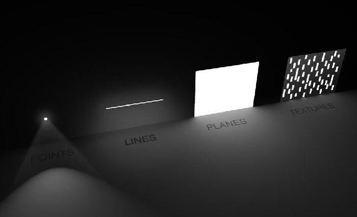 Above is a rendering I made to help explain a basic way to categorize light sources. Lighting can be broken down into three fundamental geometric categories: point sources, linear sources, and planar sources.
